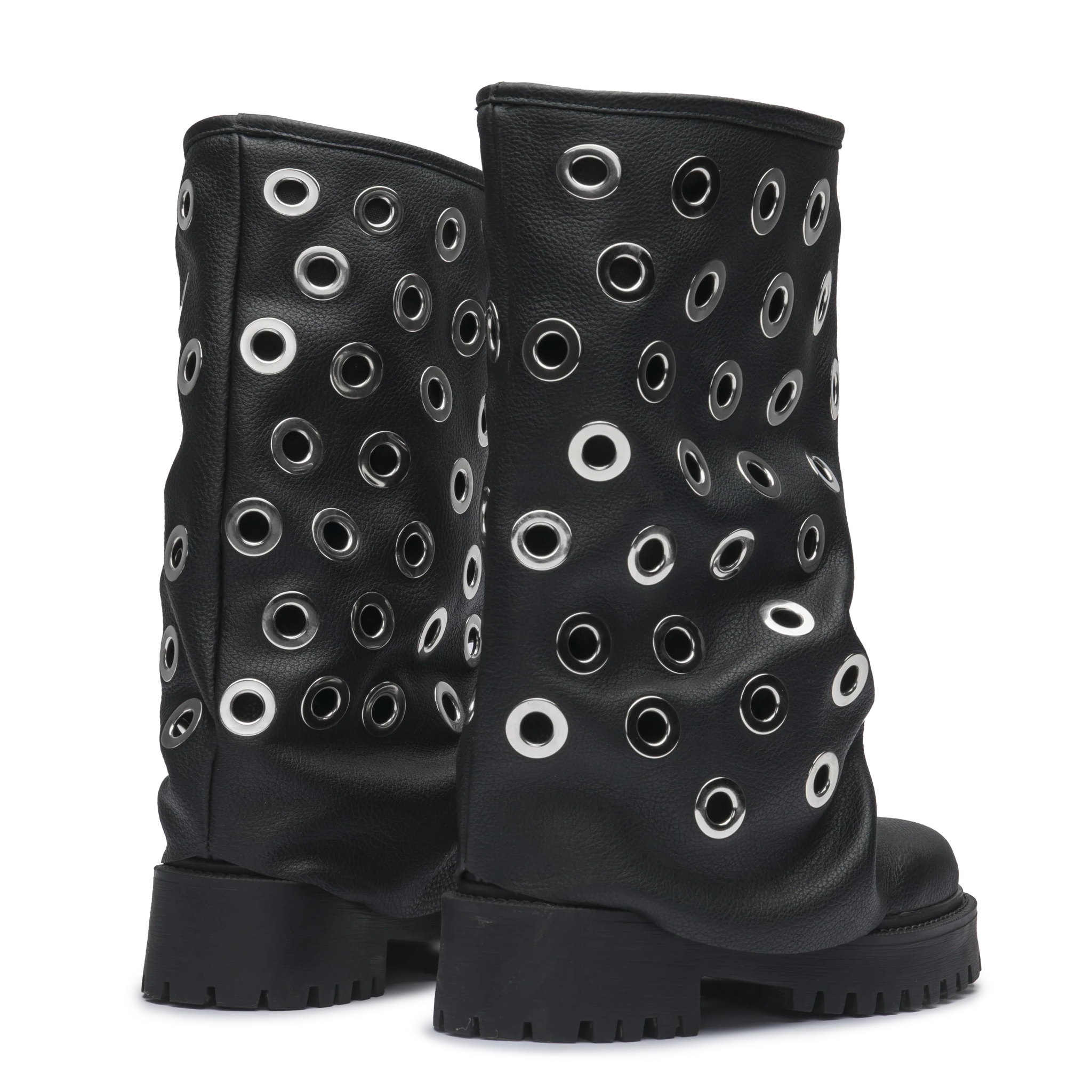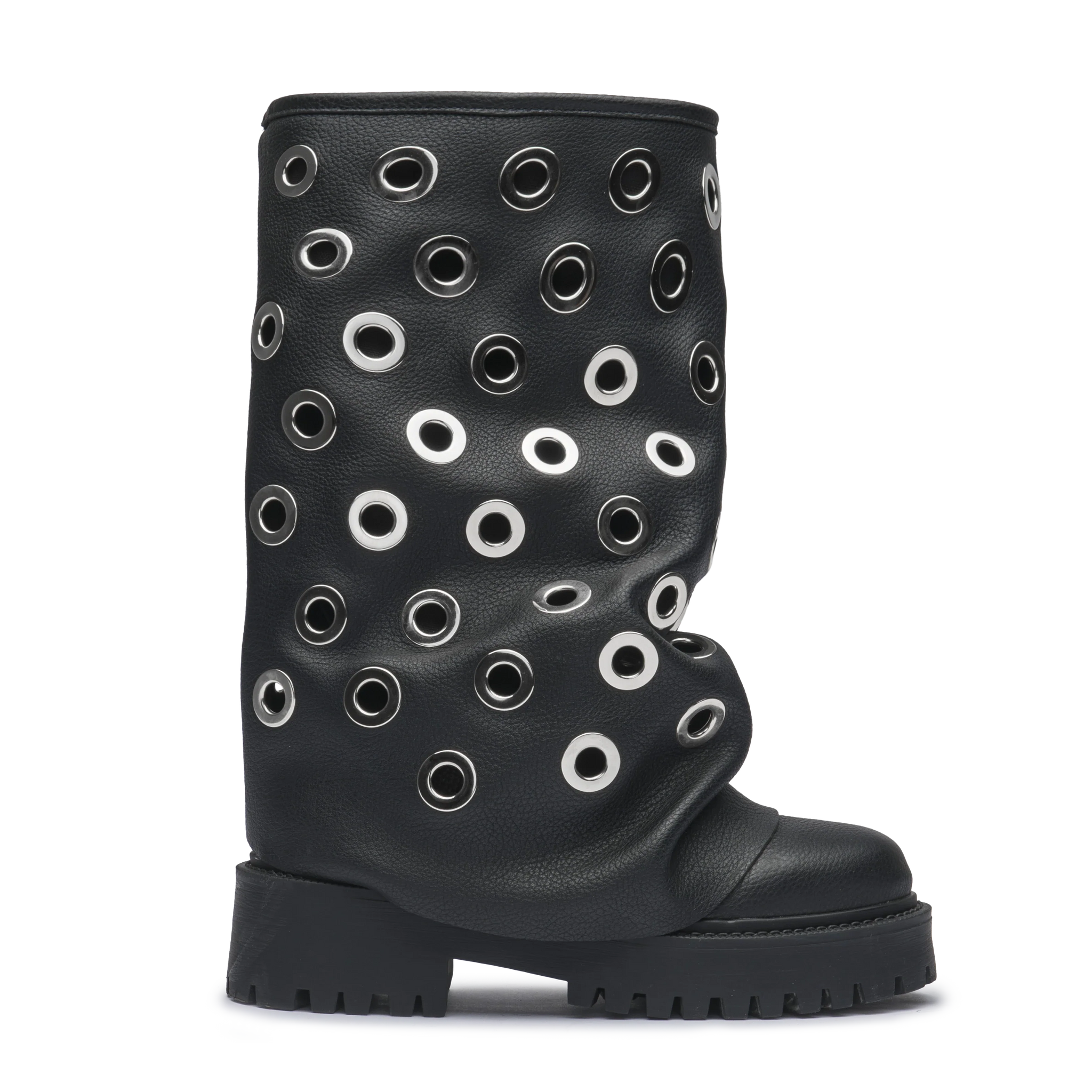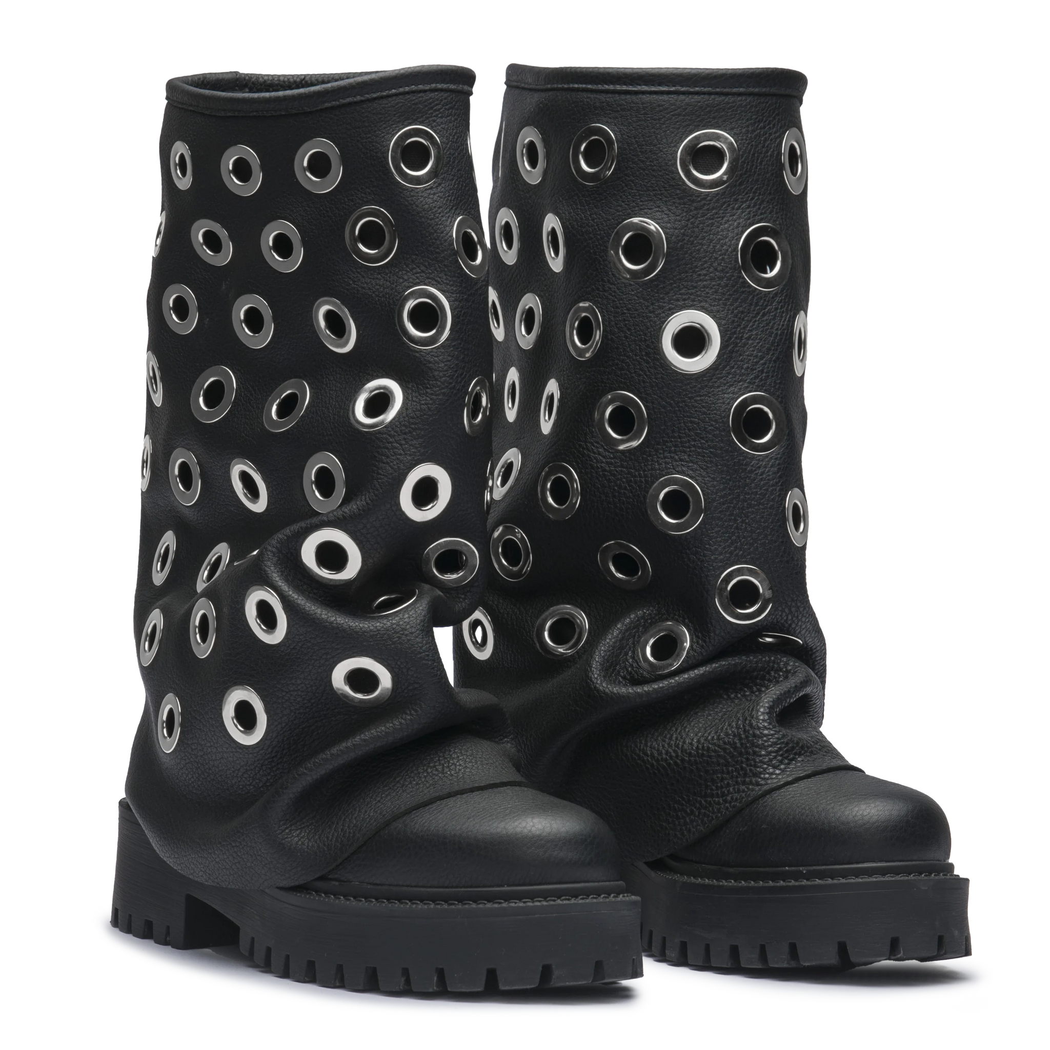 The CHUNKY – Black Silver Giant Eyelets Edition redefines the CR03 aesthetic through a bold play of texture and metal. Crafted in soft black leather and enhanced with oversized golden eyelets, it delivers a sculptural, rebellious identity. A chunky lug sole adds grip, strength and unmistakable style.