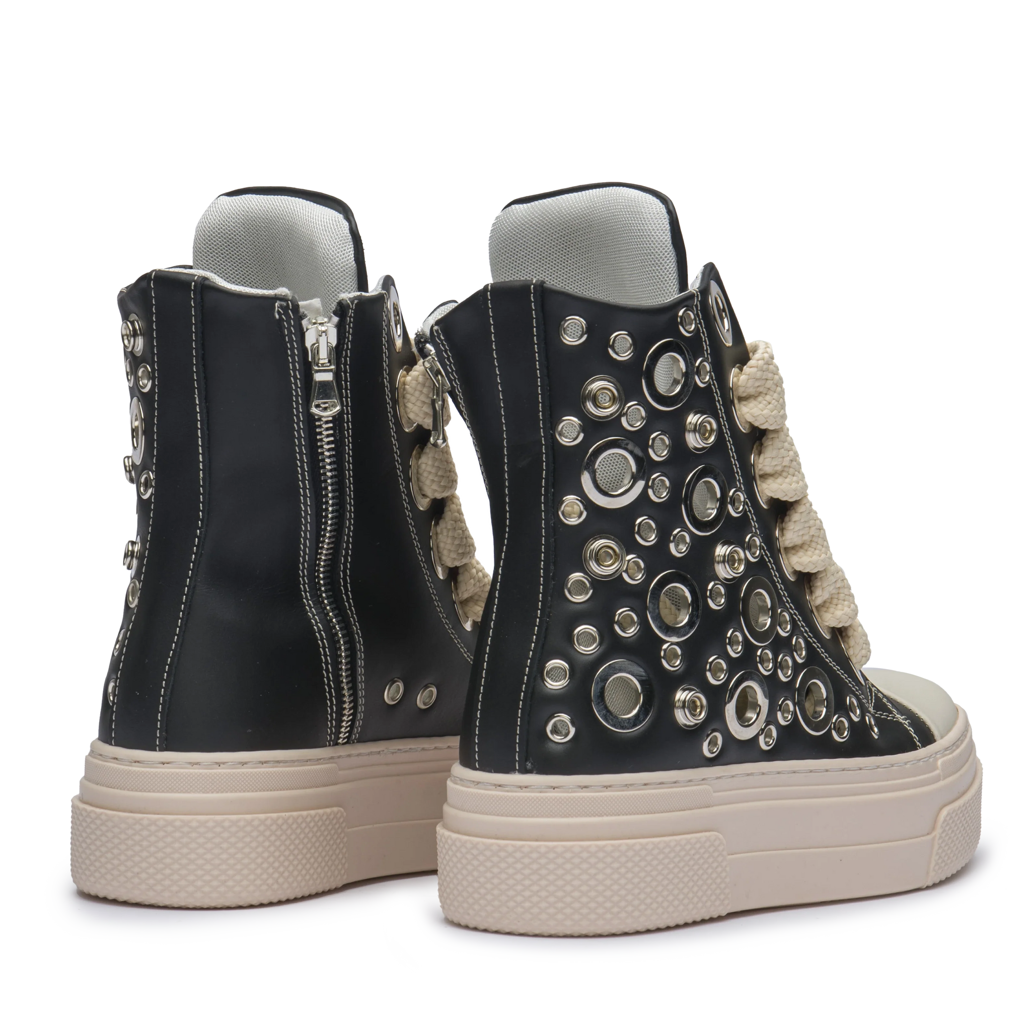 CALIPSO BLACK CHROME combina pelle nera con dettagli silver a contrasto e lacci in cotone color crema. Un design pensato per dominare la scena urbana con forza e stile, esaltando l’attitudine luxury street di CR03.
