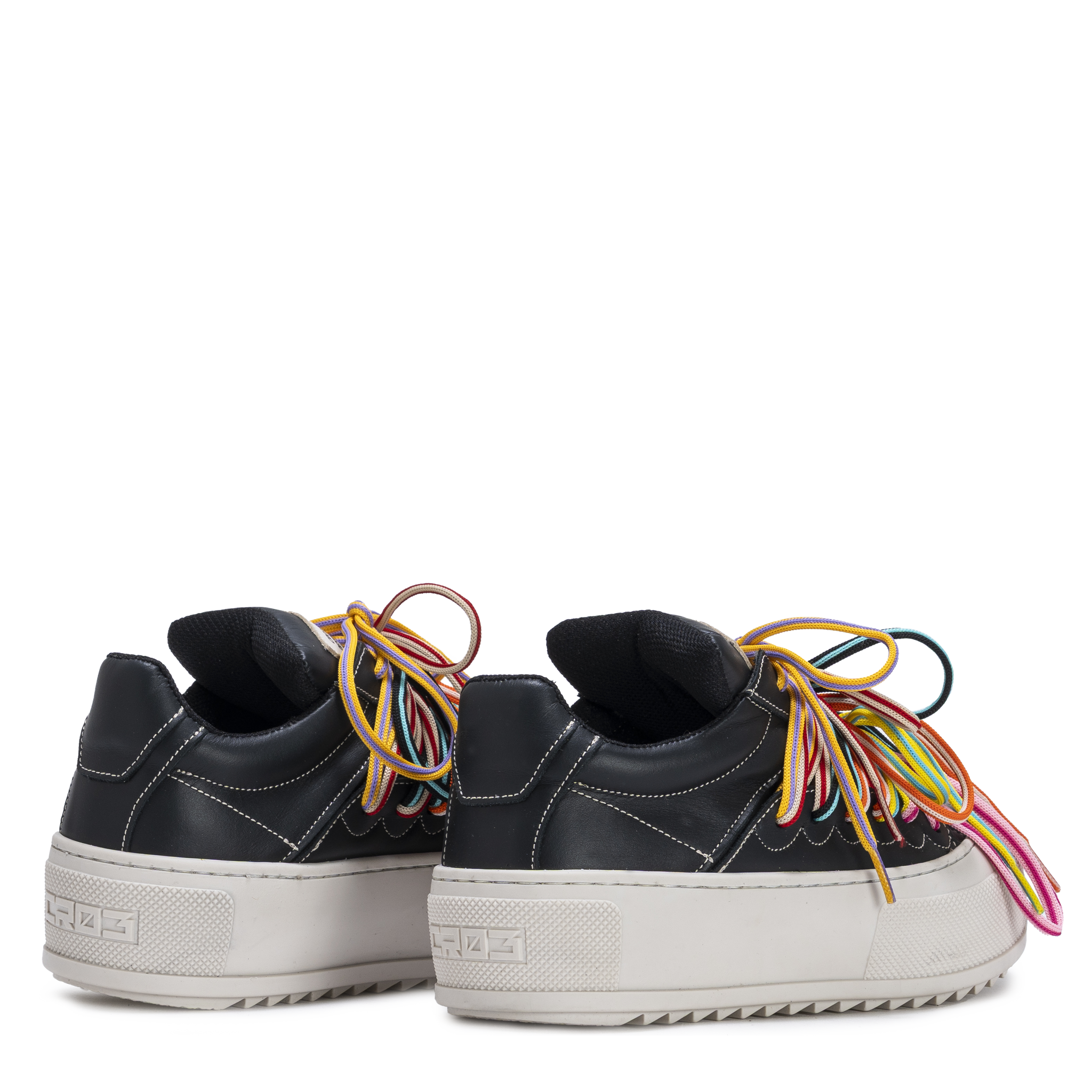 Crafted in smooth black leather, CHAOS NIGHT balances bold multicolor layered laces with a clean architectural platform sole. The contrast between structured base and visual movement creates a confident, urban statement.
