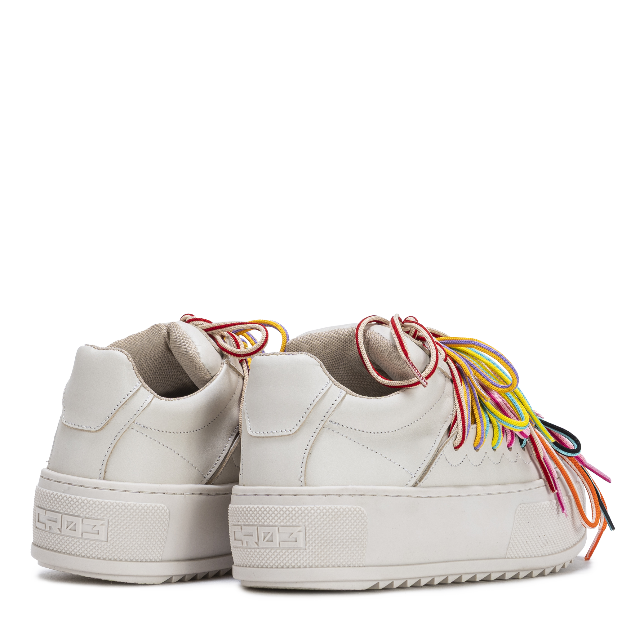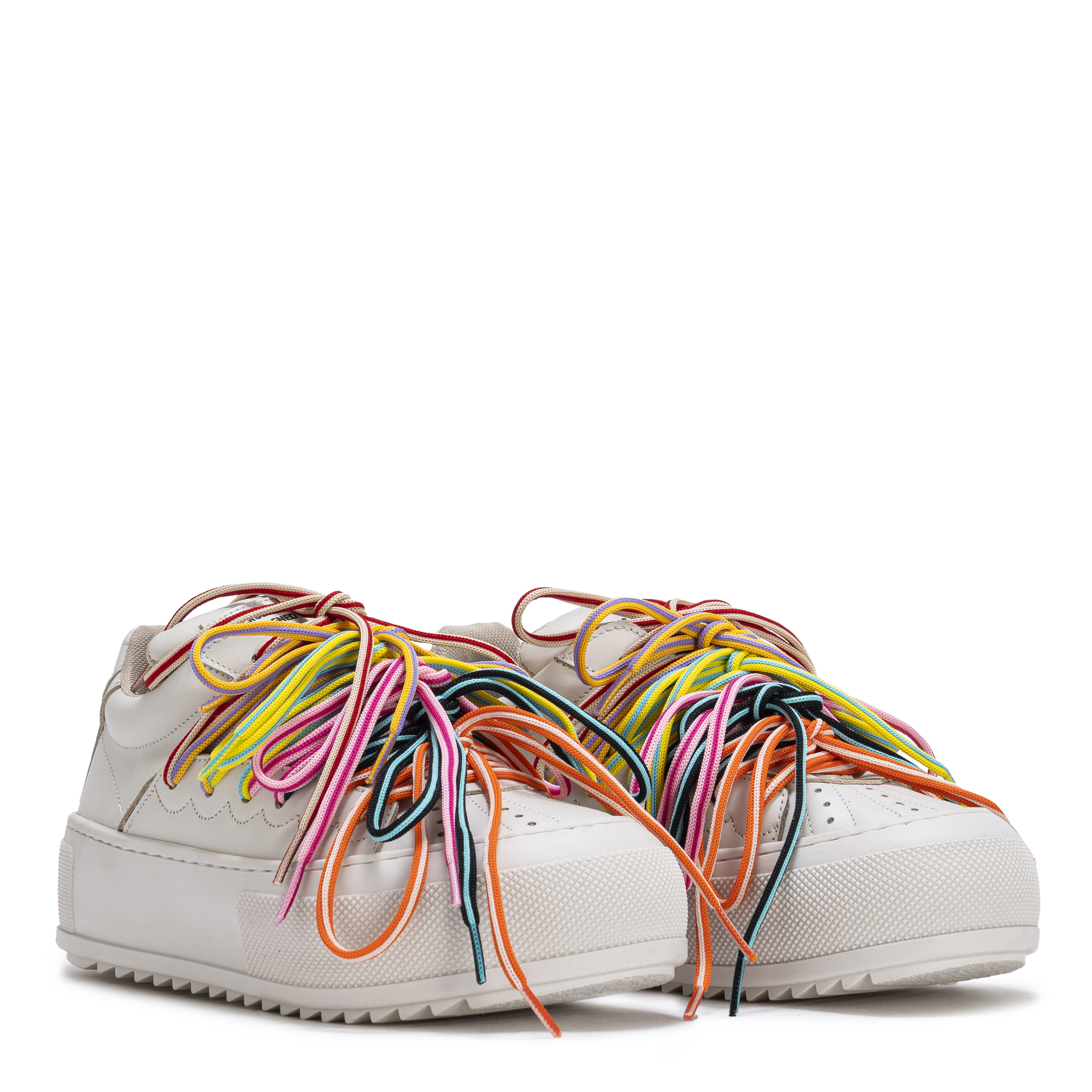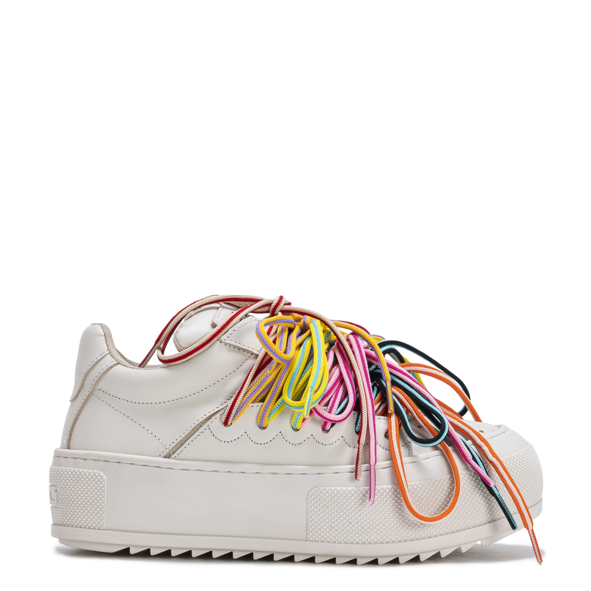 Crafted in smooth white leather, CHAOS keeps the silhouette minimal while the upper is overtaken by layered multicolor laces that create movement, volume, and visual tension. The structured platform sole grounds the design, balancing energy with stability.