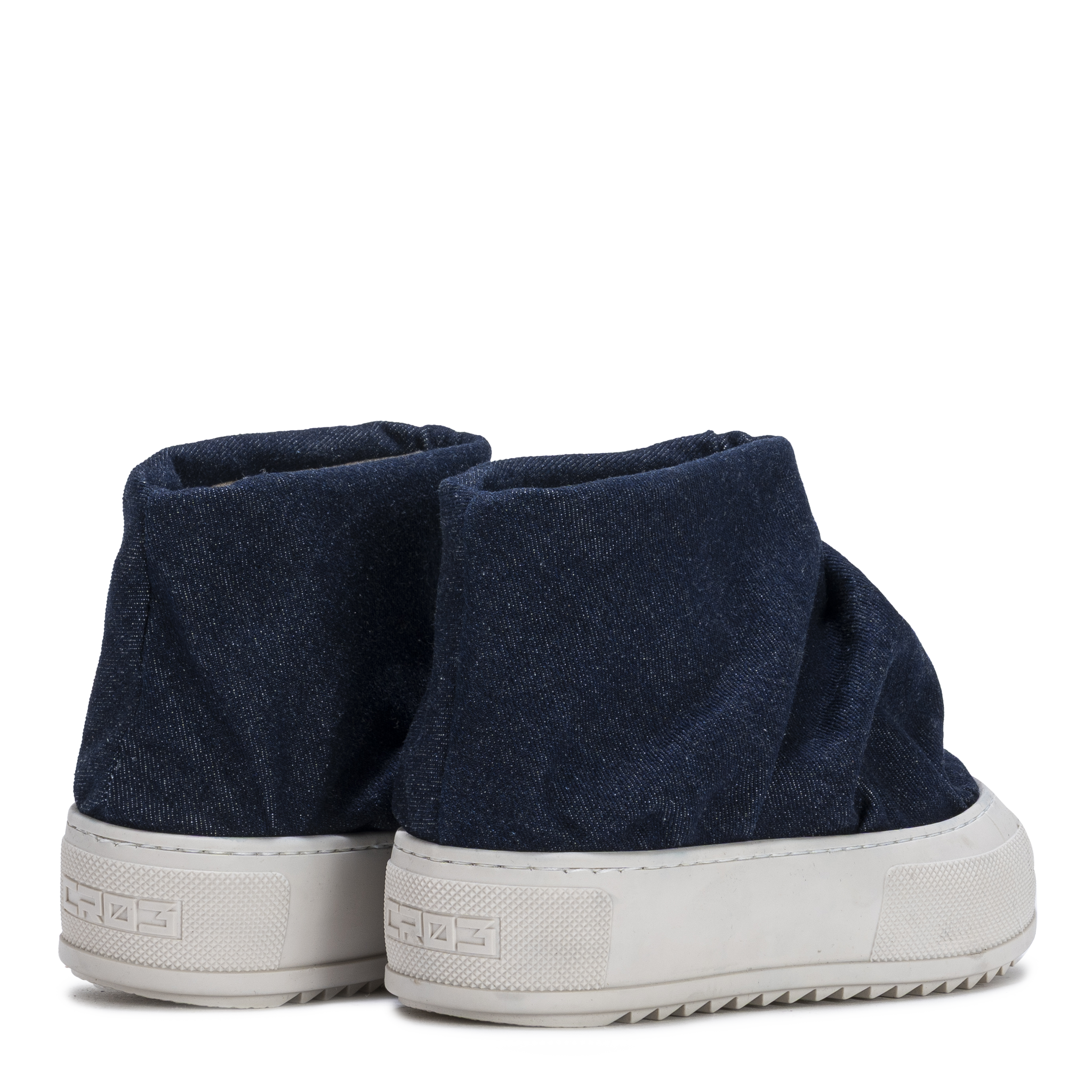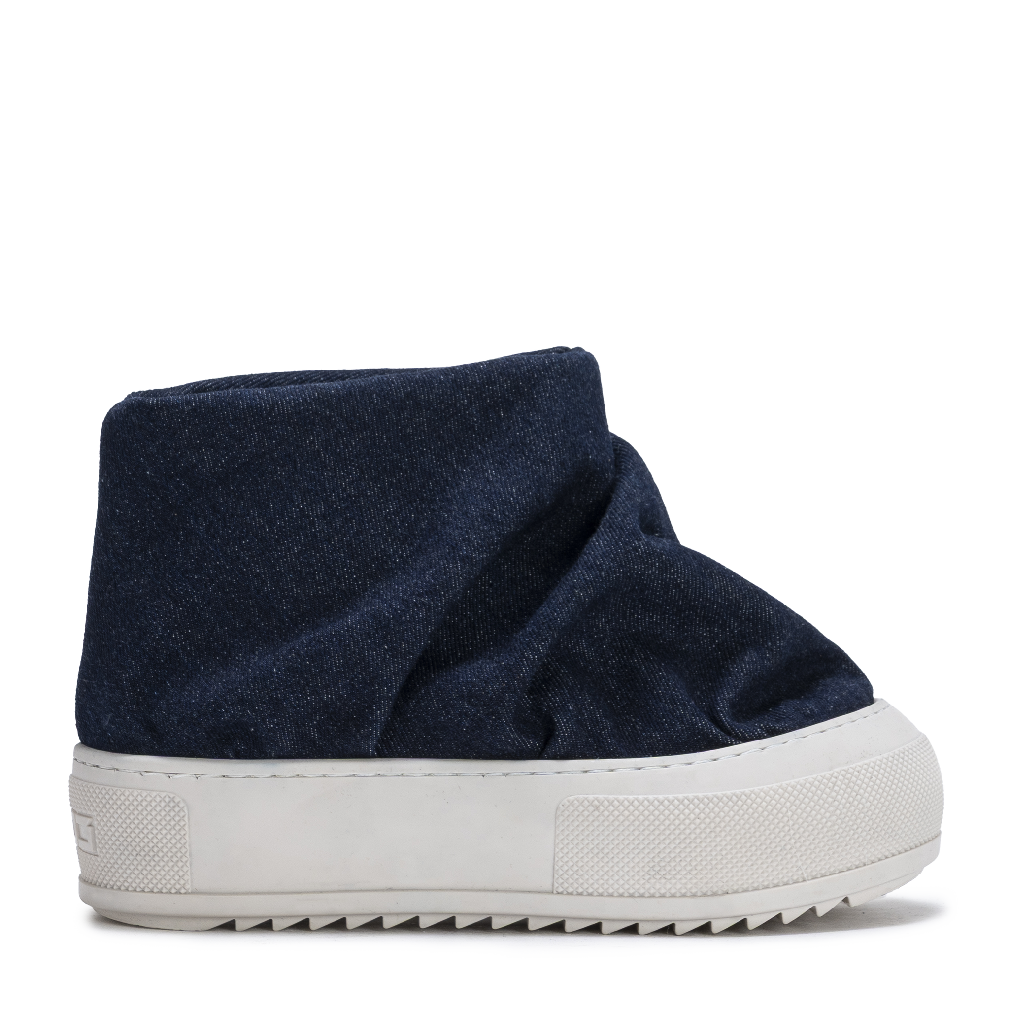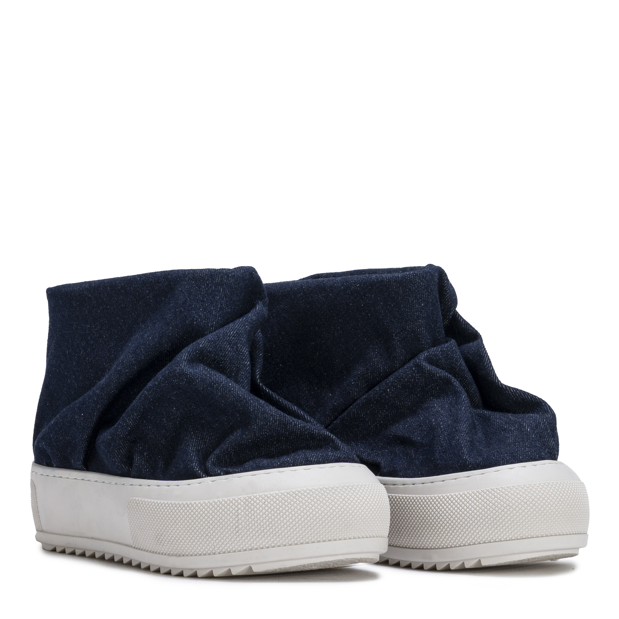 A bold slip-on boot crafted in soft indigo denim, defined by its fluid draped silhouette.